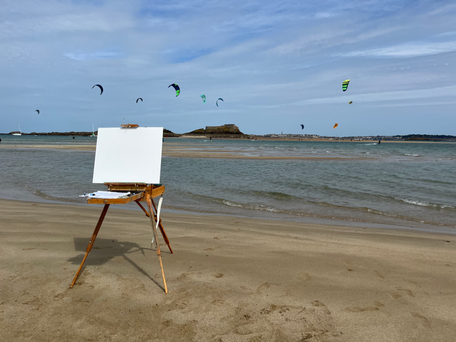Merci à mes amis pêcheurs qui m'ont embarquée dans leur virée et qui m'ont déposée sur le banc de Harbour pour une séance de peinture à marée basse. Le vent était au rendez-vous et j'ai peint, face à Saint-Malo et Cézembre, au milieu des kitesurfeurs.